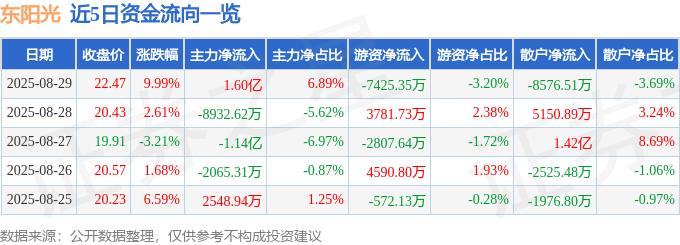 证券之星消息融通资产,东阳光8月29日涨停收盘,收盘价22.47元。该股于14点42分涨停,2次打开涨停,截止收盘封单资金为3972.7万元,占其流通市值0.06%。